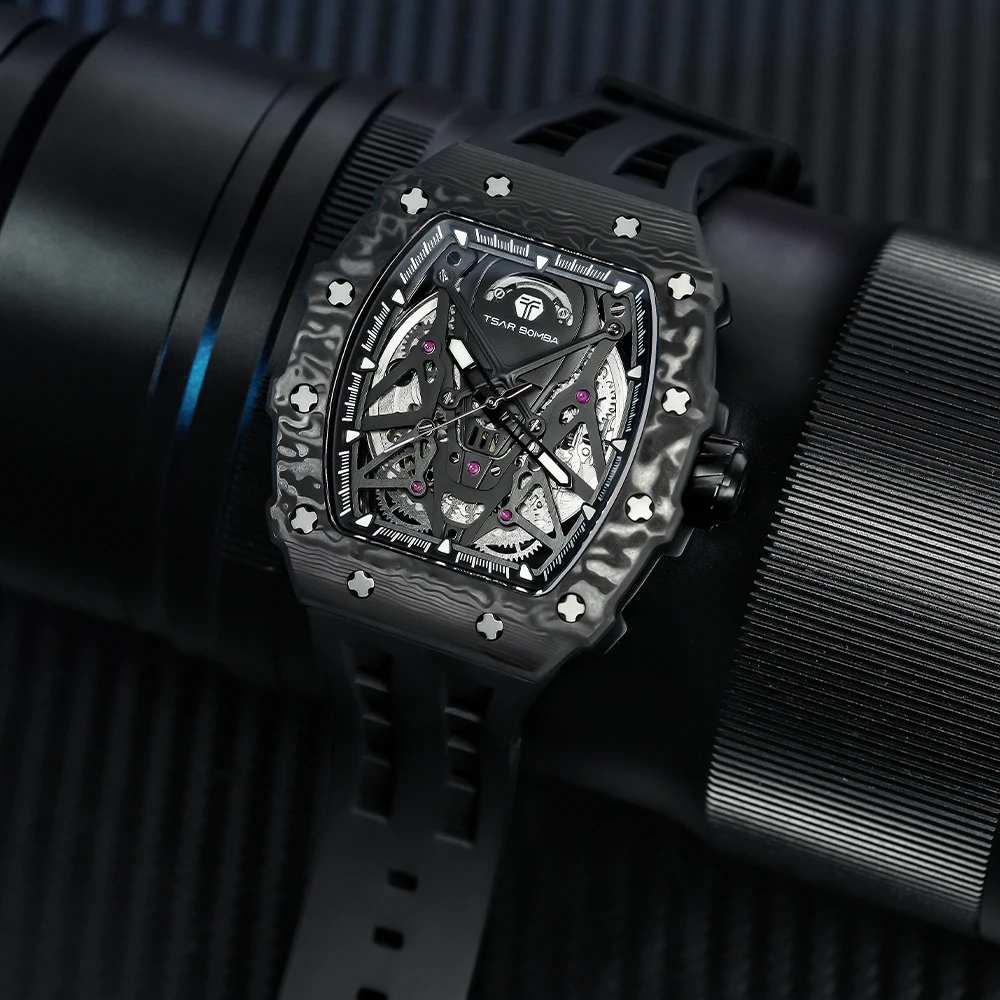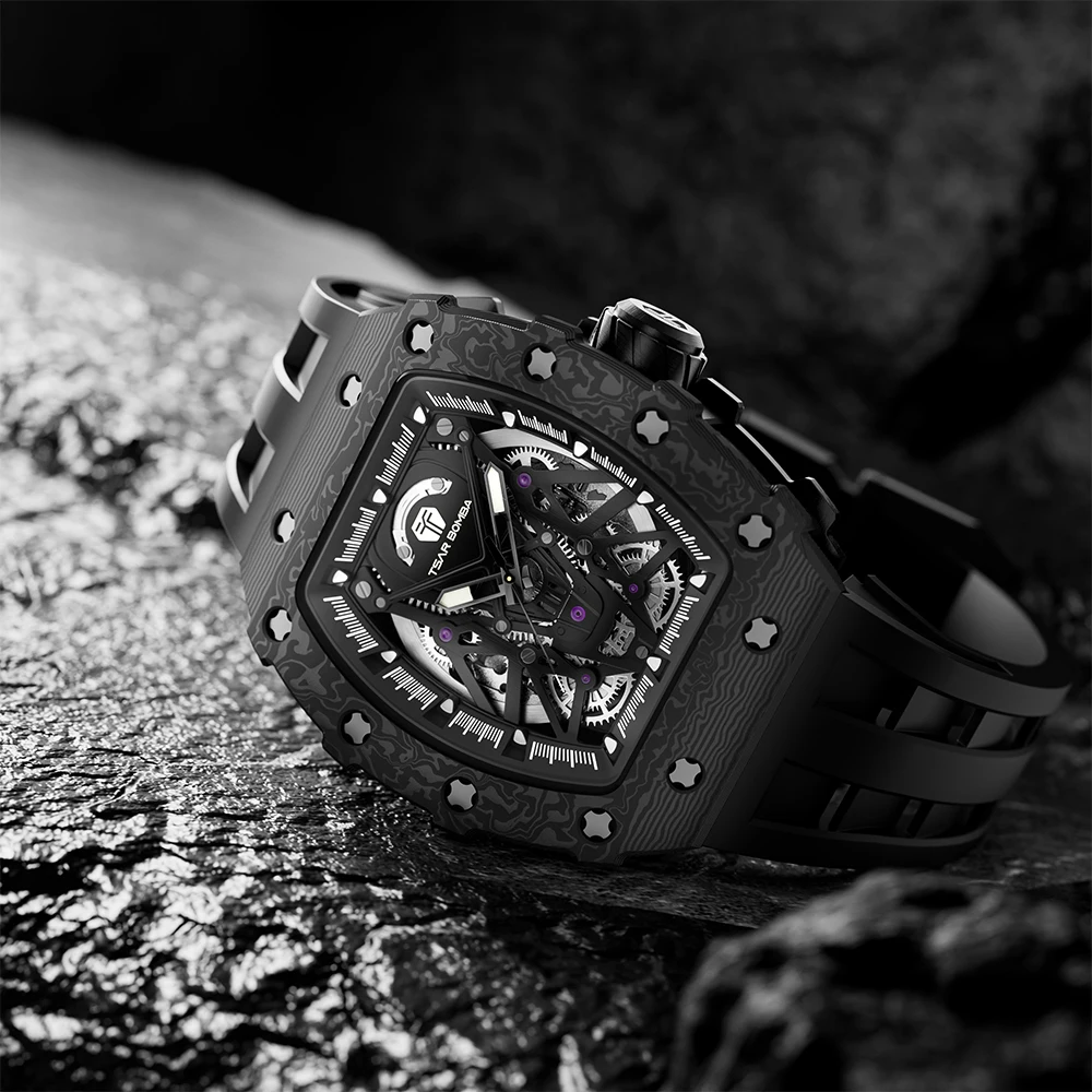 For TB8207 Luxury Men's Automatic Mechanical Tonneau Watch with Sapphire Crystal Glass Rubber Band Water Resistant